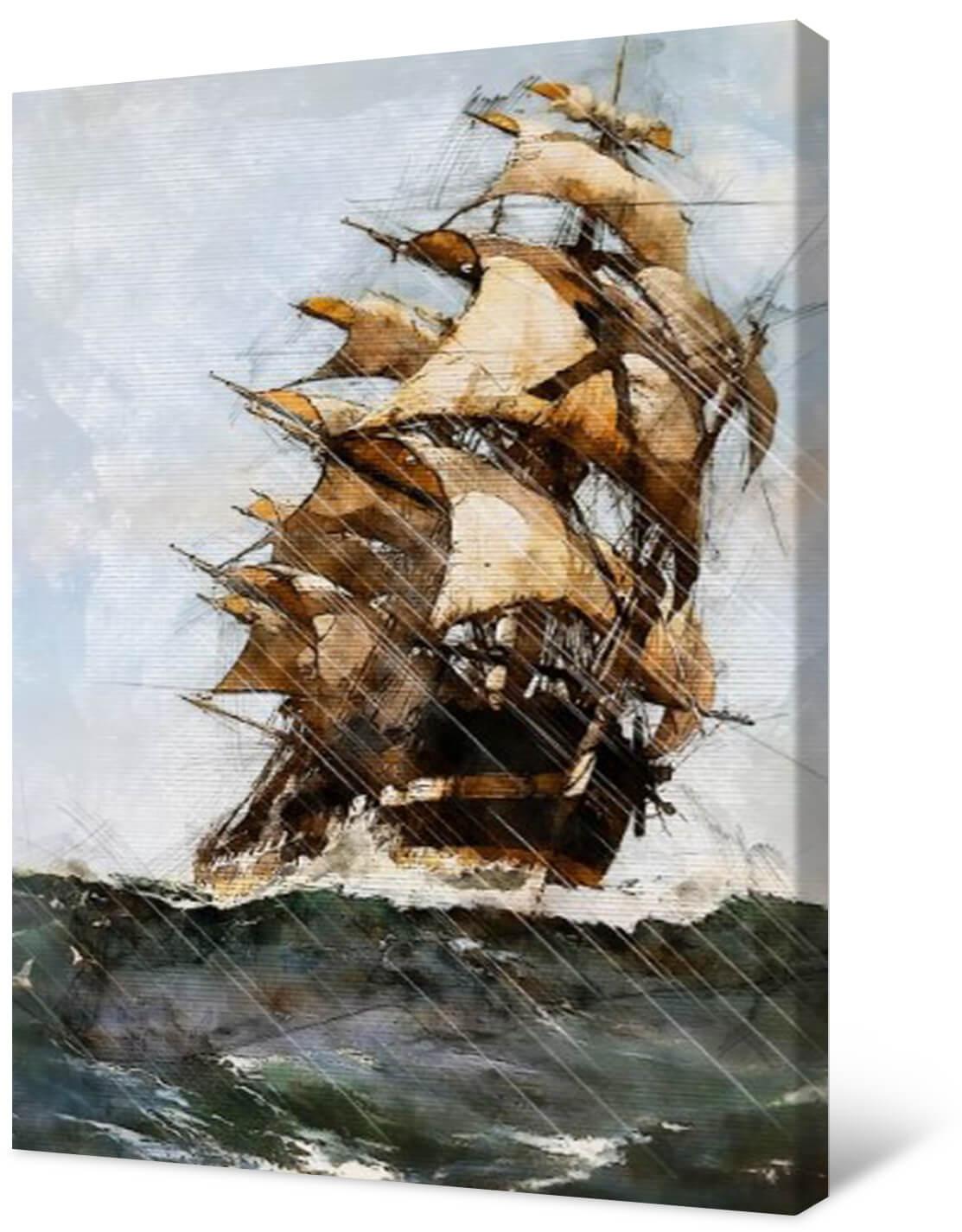 Fotografia na płótnie Burza. Duży statek z pięknymi żaglami zmaga się z naturalnym zjawiskiem. Doda charakteru wnętrzu, szczególnie miłośnikom marynistycznych motywów.