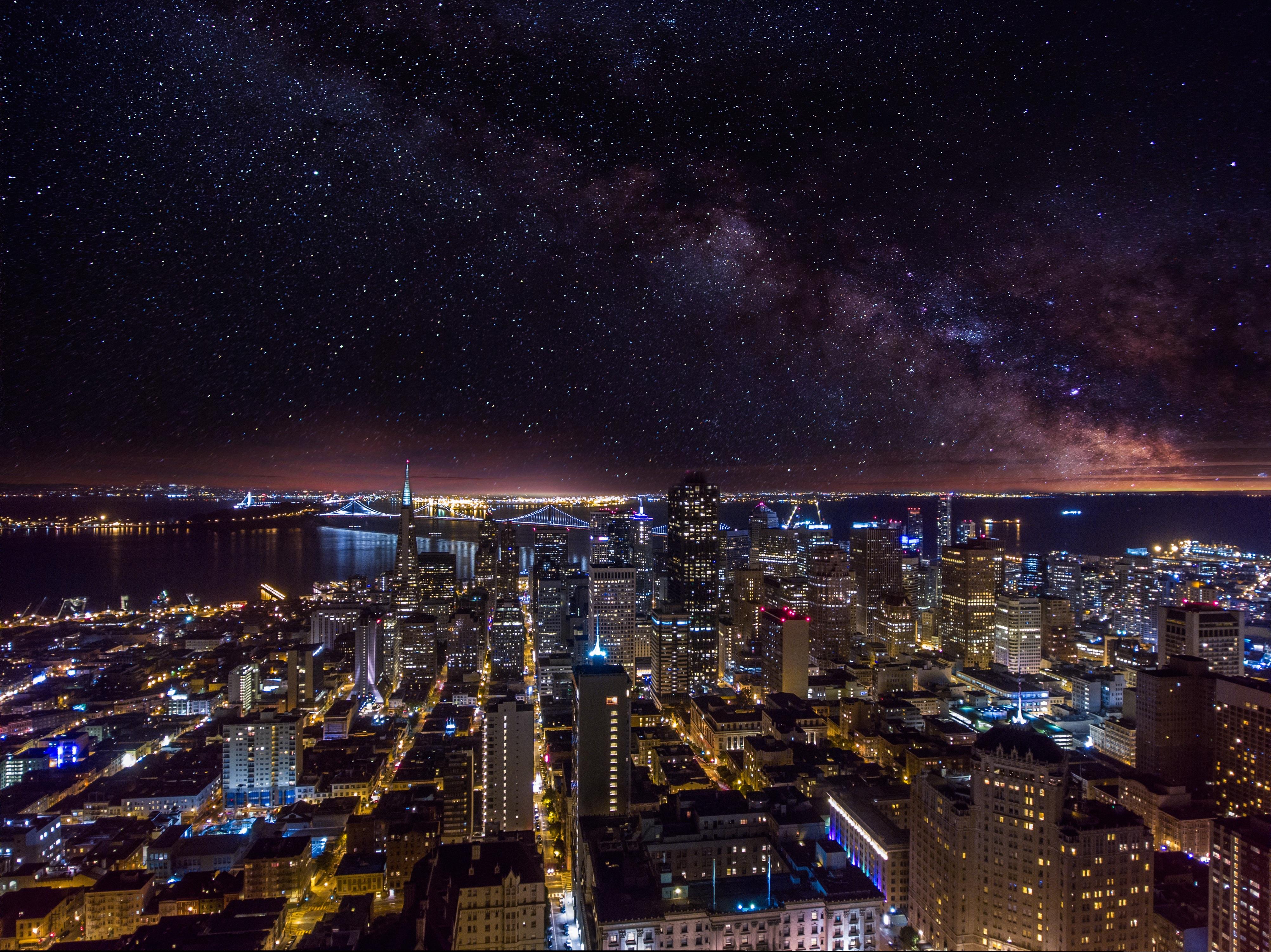 Piękny widok miasta nocą z lotu ptaka jest hipnotyzujący. Nocne światła miasta migoczą jak gwiazdy na niebie