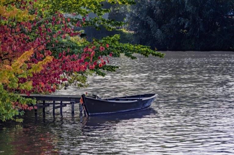 Drewniana łódź jest przywiązana do molo na tle spokojnego krajobrazu, w którym nikogo nie ma. Na pierwszym planie kolorowe liście, co rozjaśnia monotonię obrazu.