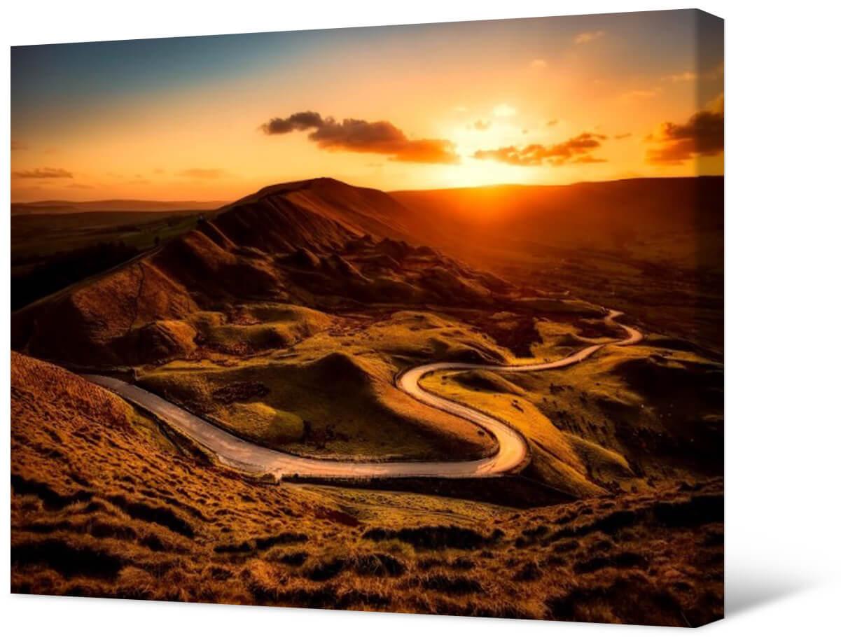 Fotografia na płótnie Anglia, kręta droga. Samotna droga o zachodzie słońca wygląda tak, jakbyś chciał przejechać się kabrioletem na wietrze.