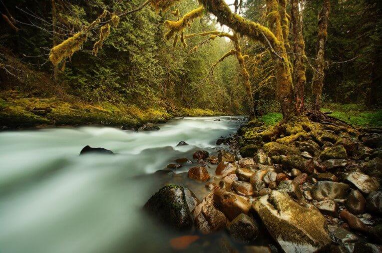 Fotografia - zwalone drzewo i kwitnący kwiat na brzegu zbiornika