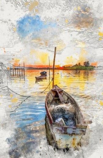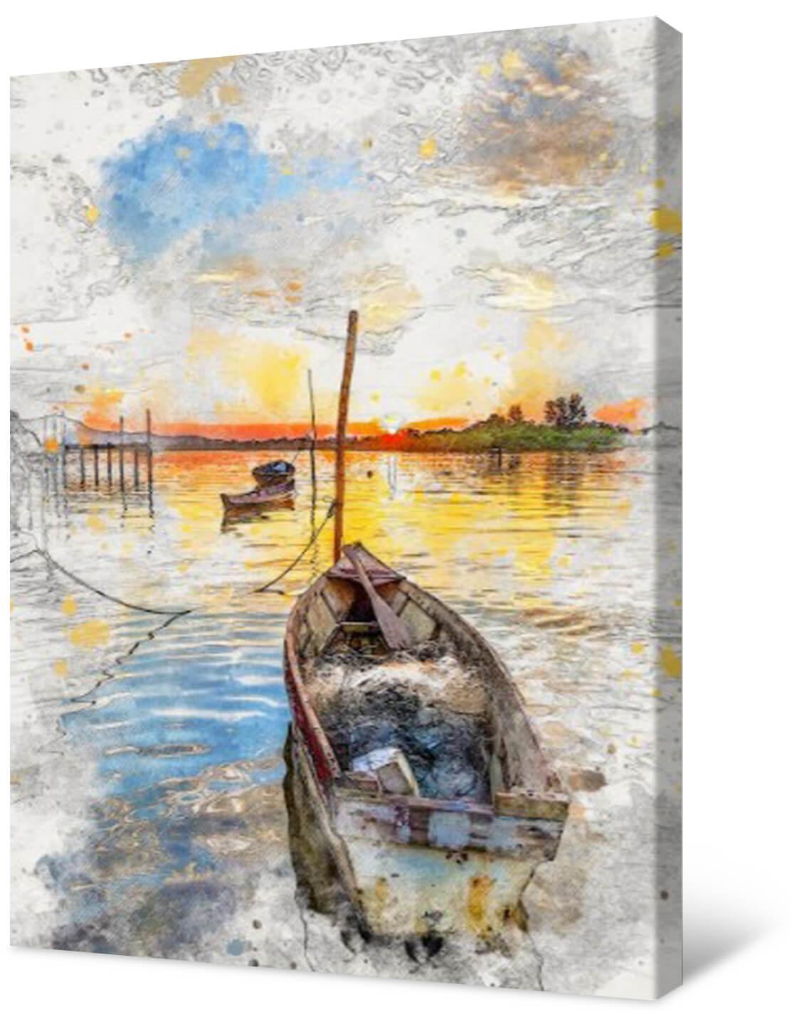 Fotografia na płótnie Łódź przy molo. Obróbka akwareli pozwoliła uzyskać szczególnie delikatny i piękny obraz.