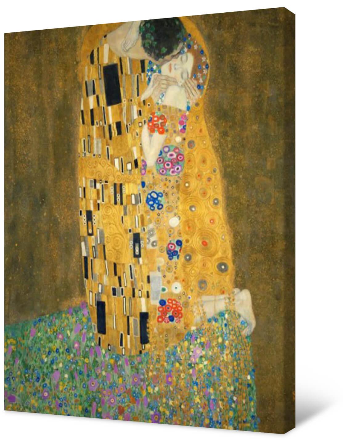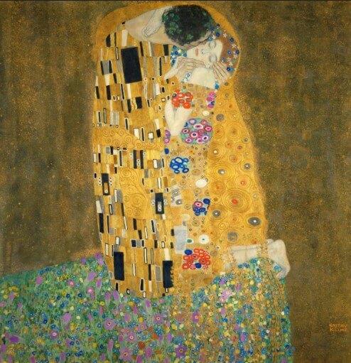 Obraz Gustava Klimta „Pocałunek”. Złote szaty łączą je w jedną figurę, a jedynie różnica w zdobieniach pozwala wizualnie oddzielić jedną figurę od drugiej. Mężczyzna ma wyraźną funkcję dominującą - góruje nad ukochaną, jednocześnie chroniąc i dominując.