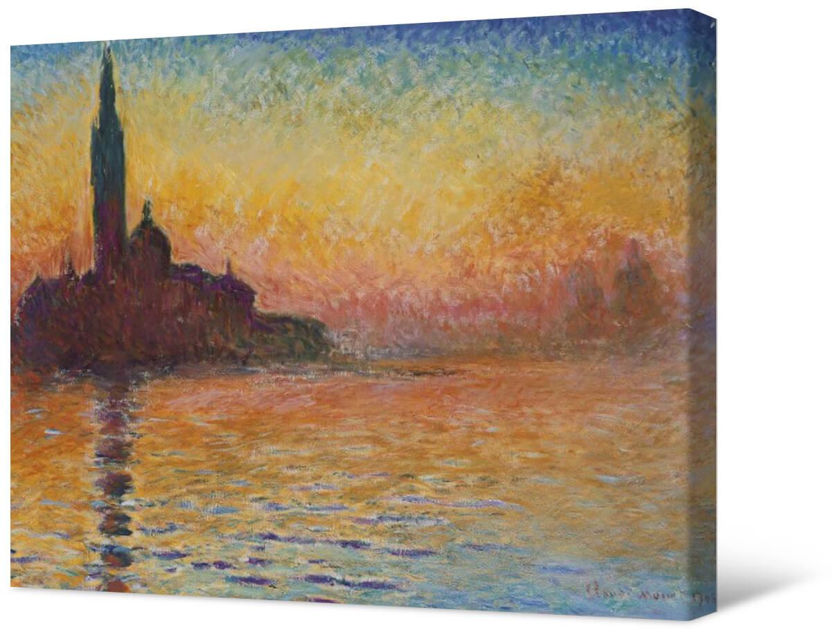 Obraz San Giorgio Maggiore o zmierzchu, Wenecja, 1908. W 1908 Claude Monet wyjechał do Wenecji. Tam znalazł coś, co uważał za najwspanialszy zachód słońca, jaki kiedykolwiek widział, oraz miasto, o którym powiedział, że jest „zbyt piękne, by je malować”. Stworzył niesamowite obrazy klasztoru San Giorgio Maggiore, które widział z okien hotelu. Na zdjęciu kolory dosłownie wyskakują z płótna, a następnie stłumione odbijają się w wodzie.