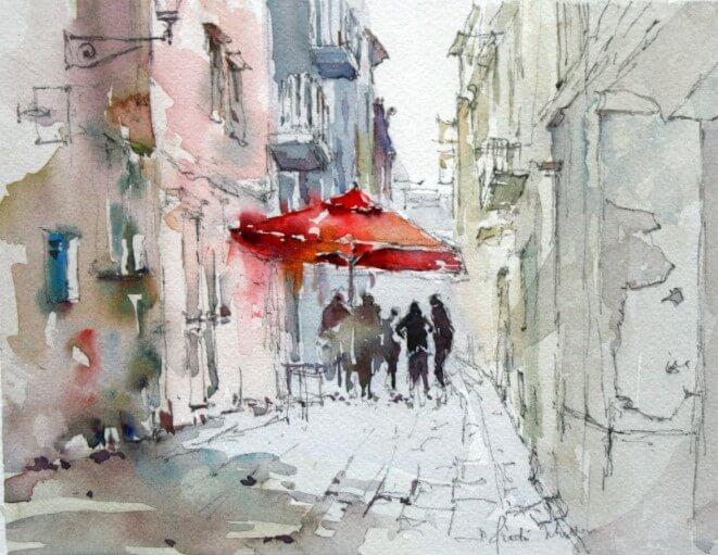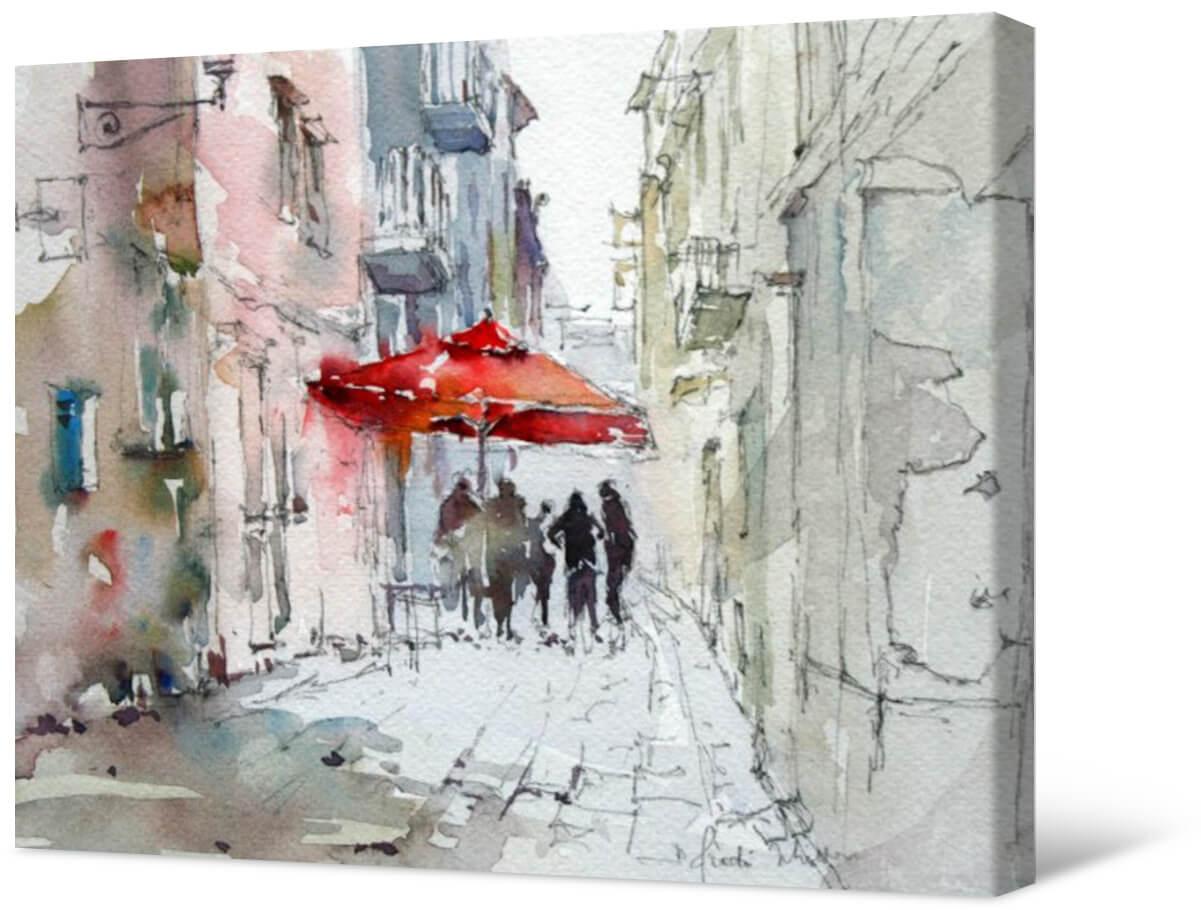 Fotografia na płótnie Czerwony parasol. Szara wąska uliczka z jasnym akcentem w postaci czerwonego parasola rozcieńczy wnętrze jasnością.