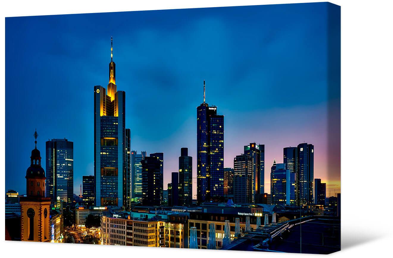 Zdjęcie Frankfurtu nocą. Przedstawione jest miasto nocą, świecące światłami na tle ciemnoniebieskiego nieba.