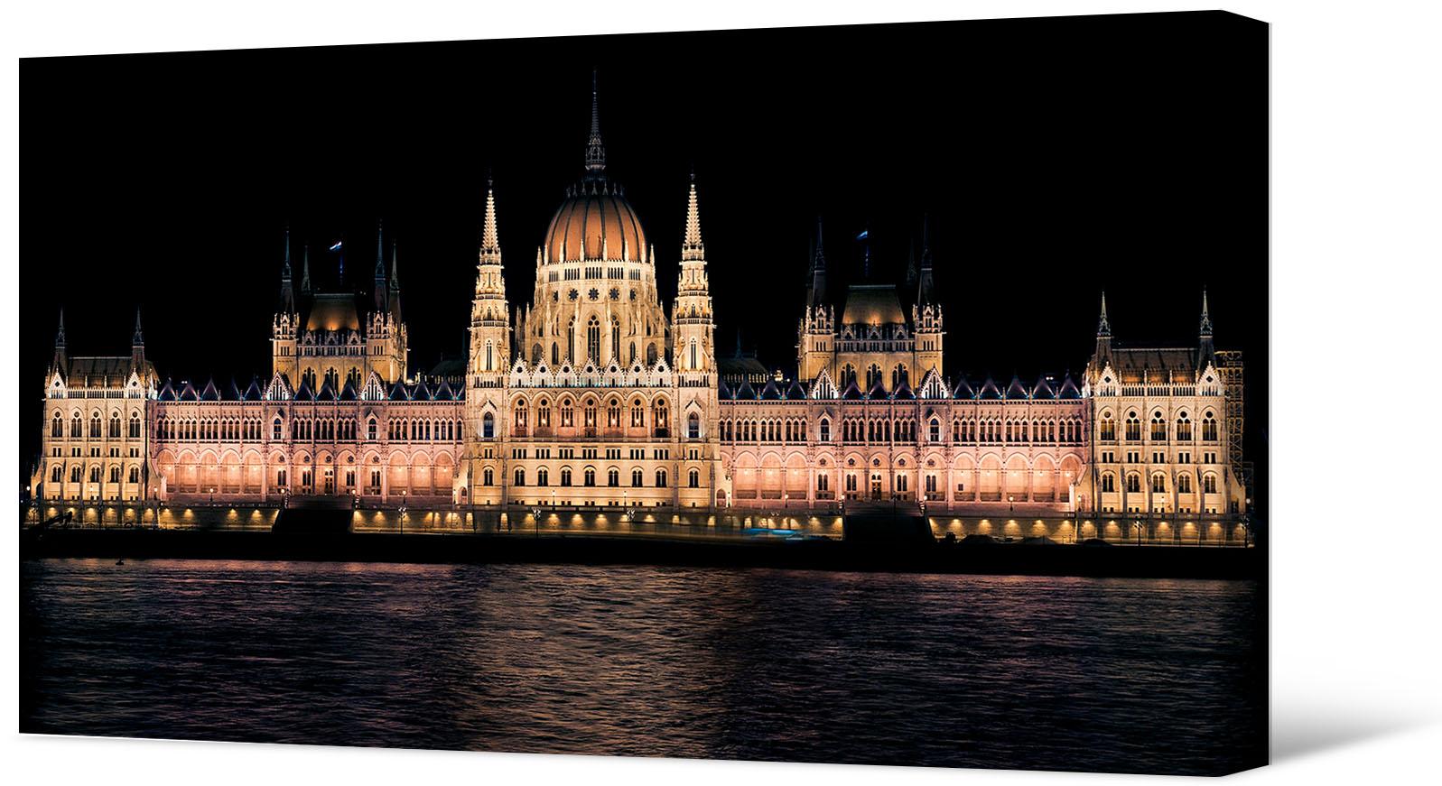 Fotografia na płótnie Nocny Budapeszt. Przedstawia jedną z głównych atrakcji miasta - budynek węgierskiego parlamentu. Został zaprojektowany i zbudowany w stylu neogotyckim. Budynek wygląda imponująco pod każdym kątem, ale najbardziej zapierająca dech w piersiach panorama otwiera się od strony Dunaju.