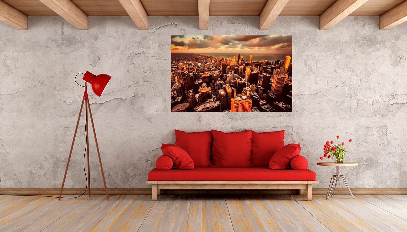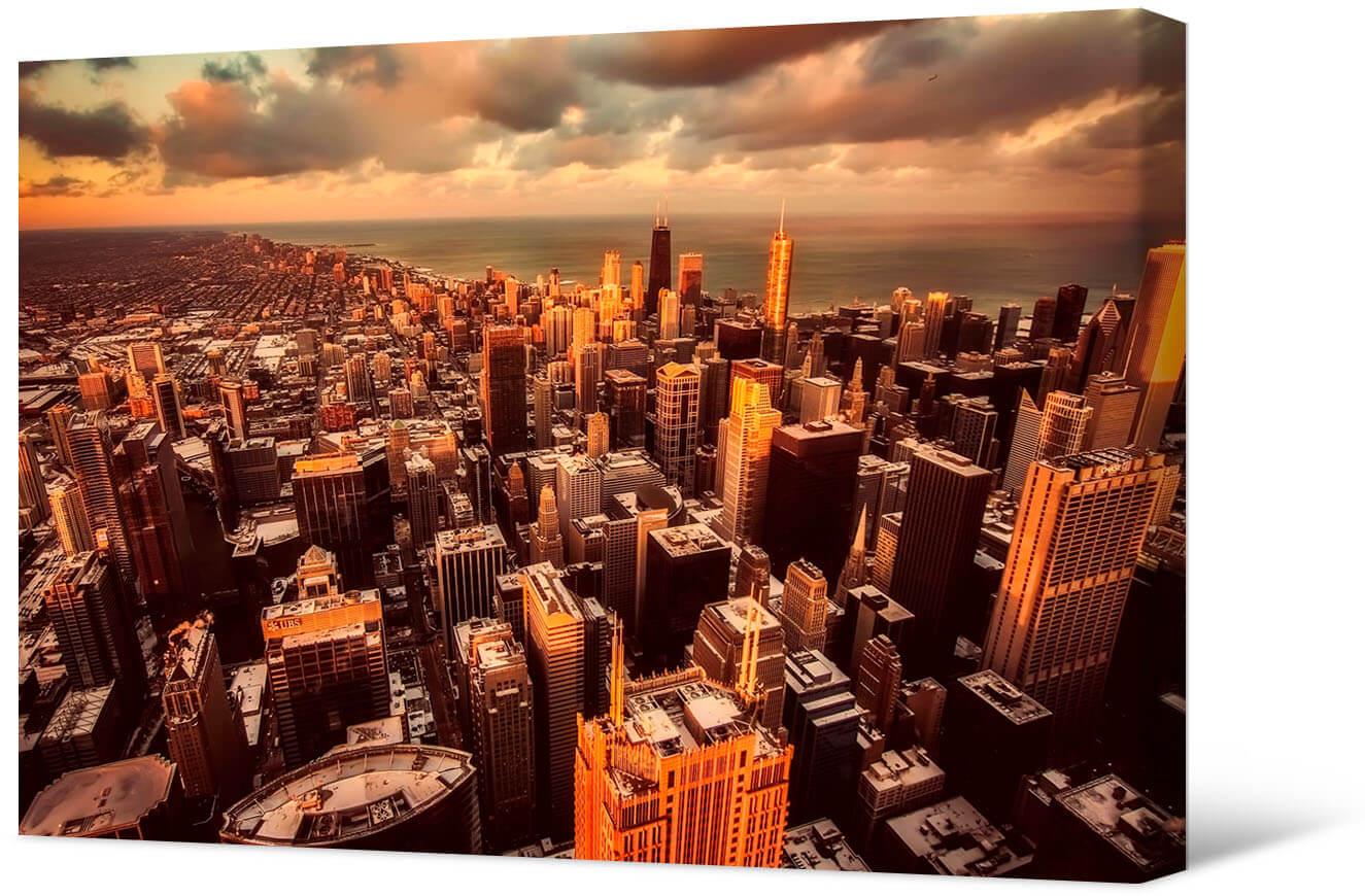 Fotografia na płótnie Zachód słońca nad Chicago. Z lotu ptaka artysta proponuje podziwianie gry światła zachodzącego słońca i majestatycznej metropolii.