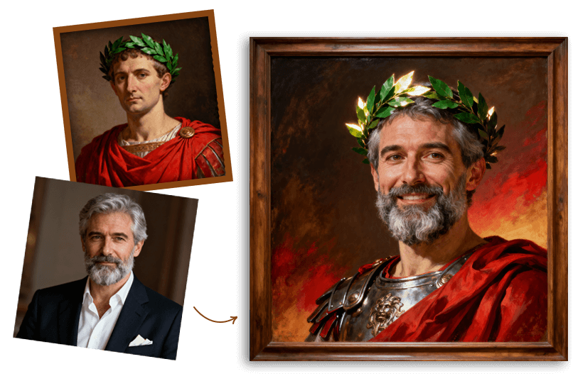 Artysta umiejętnie łączy Twoją twarz z naszym wizerunkiem, a następnie drukuje na płótnie lub oprawionym papierze!